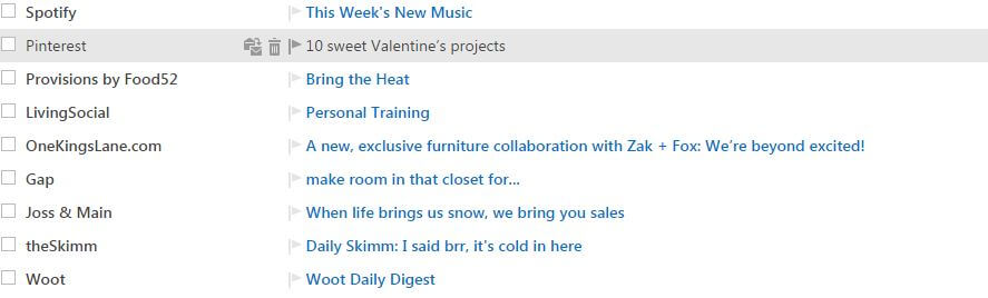 Below is an example of a Bramble Berry employee’s inbox. What subject line makes you want to click through and open the email? Personally, I’m most tempted by the “10 sweet Valentine’s projects,” and “make room in that closet for…” subject lines. The subject line from Pinterest is enticing because it tells me the email is going to be full of DIY content. The Gap’s email is somewhat mysterious, and I want to find out what’s inside!