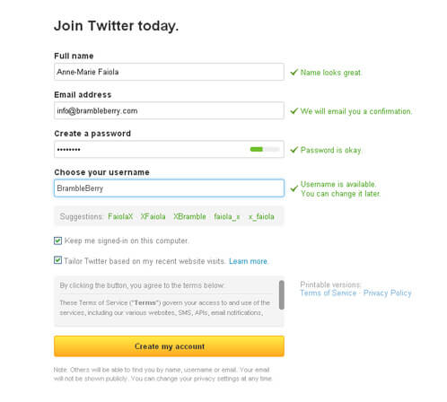TWO: After you’ve clicked the “Sign Up For Twitter” button, it will lead you to the ‘Create an Account’ page where you finish filling in the rest of the information. Be sure to choose a Twitter handle that represents you and your business, and like Facebook and Etsy, you will want to make sure it reads correctly and appropriately for your business (Example: Don’t use the acronym for ‘Anne-Marie’s Sassy Soap’).