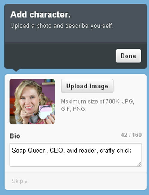 FOUR: Once you’ve confirmed your account, a set-up guide will walk you through the steps to personalize your account. A profile picture is particularly important to have. Choose something that represents your business as well as yourself. Most people choose head shots, but you can choose a picture of your soap, bath bombs or any other bath & body product that you make.  Be sure to give a quick description of yourself so that people know who you are (in 140 characters or less, of course!). You can also include the URL to your website, blog or shop as well as your location.