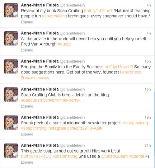Twitter is a versatile business tool. You can use it to create relationships between you and possible customers. You can use it to monitor trends. You can use it to see what your fellow soapers are up to. But, my favorite part about Twitter is the relationships: because the point of Twitter is to keep it short and simple, you can easily engage in two-way conversations with customers and potential customers and create a dialogue. After all, doing business is all about relationships and this is a great way to strengthen relationships and build new ones. You can also use Twitter to research trends in your industry (and others). And, of course, you can instantaneously highlight your products (with links), as well as sales and coupons (but you only want to do this after you’ve built relationships; Twitter isn’t a one-way tweet with you just broadcasting and never being helpful. Want to hear more about that? My social media philosophy here).