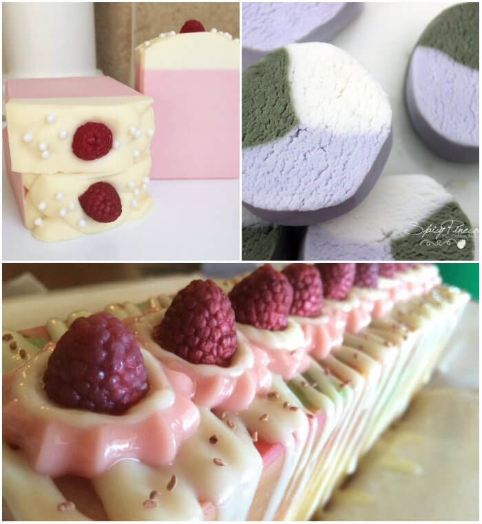 Top left, clockwise: Pink Berry Mimosa soap, Free Spirit Bubble Bath Bars and Raspberry Lemon Cookie Bar soap.