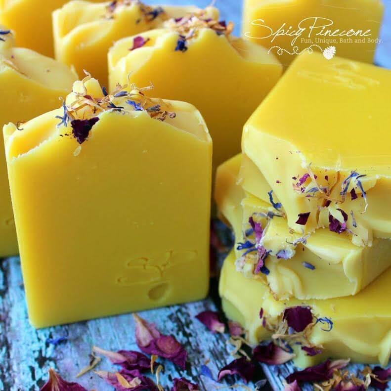 Spicy Pinecone’s stunning “Claire’s Garden”cold process soap made with heavy cream, calendula and chamomile infused oil.