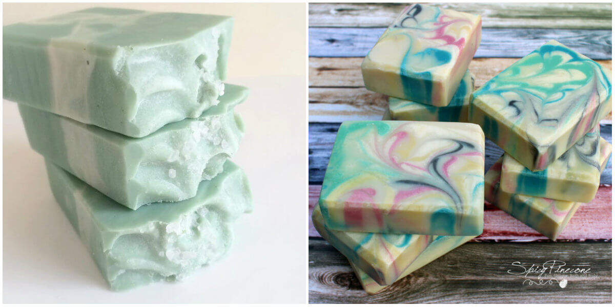 Left to right: Sarah’s beautiful Eucalyptus and Spearmint cold process soap, and the stunning Coconut Lime Verbena cold process soap.