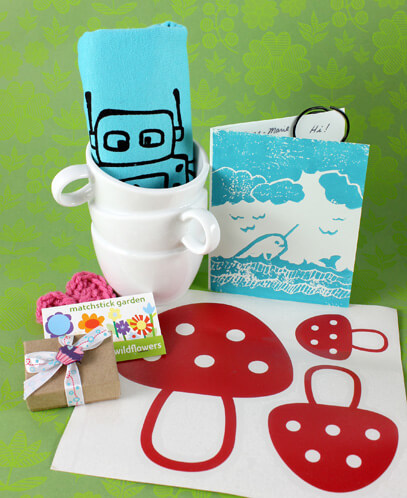 Our kit came with some matchstick plant seeds, mushroom decals, a knitted heart and the cutest stacked teacups mug. The blue fabric in the mug is a scarf with robot decal (so techy chic).