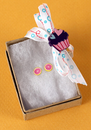 Mini grapefruit earrings inside the cutely packaged cupcake box.