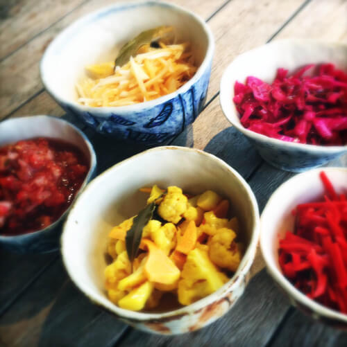 So I began to experiment with fermenting vegetables. I read Sandor Katz’ excellent books: Wild Fermentation and the Art of Fermentation, plus a dozen more by other authors. Within two years we were eating a serving of ferments every day, brewing kombucha and jun, and I was fermenting everything I could think of. The sour, salty, complex, original flavours were a revelation to us, and moreover, to all the friends and family upon whom I foisted samples.
