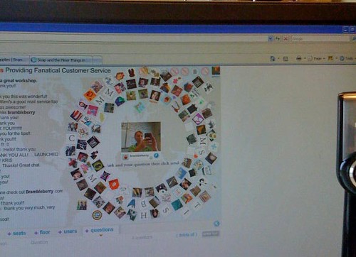 If you missed the Etsy Lab Talk today on how to provide ‘fanatical’ customer service for your Etsy shop, you missed a good time! In the photo above, you can see how many people are in the auditorium. Notice, there is standing room only – every single seat is filled with an Etsy seller (as represented by their square icon). You can see my web cam slightly off to the right of the photo. And in the middle? That’s me, taking a photo of the classroom.