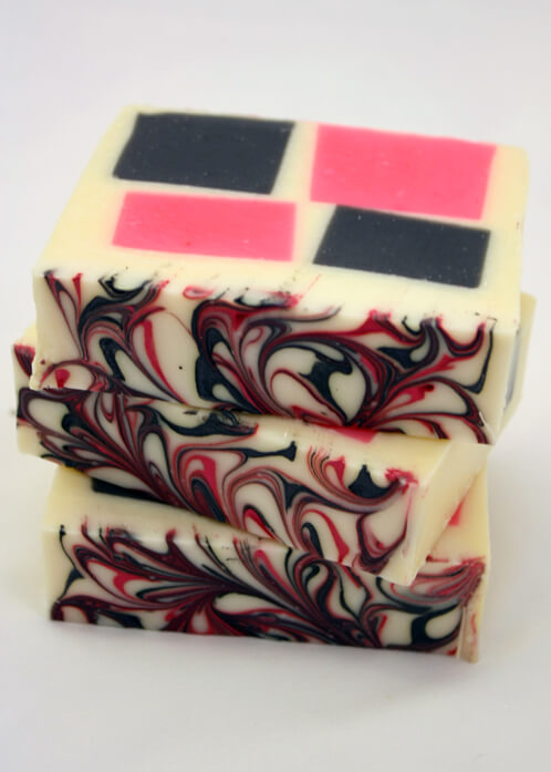 Desserts, mainly cupcakes, tend to be a huge source of inspiration. I’ll see something and I become bound and determined to replicate it in some way in soap. That’s how my pie soaps came out last summer. I was looking for a peach pie recipe and saw the lattice crust design pictured with the recipe I printed and I forgot all about making a real pie as I was pulling out my sketch book and figuring out how I could make a peach pie soap. The majority of my inspiration comes from other soap makers. Sometimes it’s their color scheme, the design, or some other small part. I have this ever growing folder of “inspirational soaps.” When I get stuck on what to do next, I go through those photos and start sketching out designs until I’ve created something new to try. Color is a big inspiration too. I love bold and bright colors. I have a small all-natural line where I use essential oils and natural colorants, but I’m happiest when I can use bright and fun colors. I love contrasting colors and I especially love using embeds. Embeds can be a bit of a pain. It turns soap into a two day process, so I have to plan well when I’m making soaps with embeds, but it’s always worth it in the end.