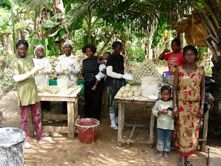 JD: The Banku soap sells 3 balls for roughly 50 cents. A full bar of key soap (about a foot and a half long) sells for about a dollar, a bar considered a single serving for about 20 cents. People coming to market buying in quantity get a discount from that. Banku soap is used for washing dishes and clothes, and sometimes people. Key soap is usually used for washing clothes, and sometimes people.