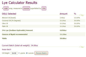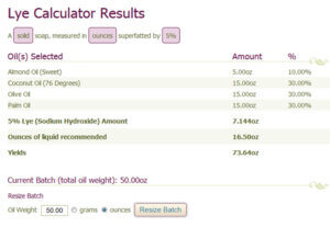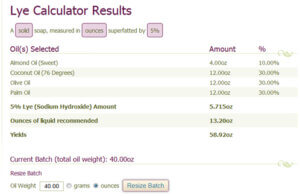 A quick note: Oil weight is not the same as yield. Often times, you’ll know the yield but not the oil weight.  I know water makes 35% of my soap batch – but if you don’t want to do the math- the lye caluculator makes it easy  In the event you didn’t know the oil weight for a 50 oz. batch of soap was 34 oz., you could have simply entered the yield in the oil weight box. Then, you could use the Resize Batch option on the next page to keep resizing the oil weight until the yield equaled 50 oz. It’s the non-math way to figure this out.
