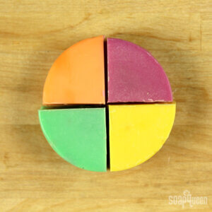 Here the soap circle is comprised of 2 parts green soap, 1 part fuchsia soap and 1 part yellow soap. Another way to say this is the green soap represents 50% ( or 1/2) of the circle while the fuchsia and yellow soap each represent 25% (or 1/4) of the soap.