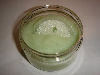 Dianne from Dearly Yours brought a special Coconut Macadamia Sea Salt Scrub (scented with Cucumber Melon) for me. The scrub has a melt and pour Cucumber on top. The soap slice is a sophisticated touch.