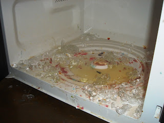 The glass, the oils and the wax were all over the microwave; my brother’s taunting laughter filled the air. It was humorous (yet also mildly embarrassing). On a serious note, both Linda and I are lucky that we had not opened the door to the microwave prior to the big BOOM! We could still be picking out glass from our gentle faces.