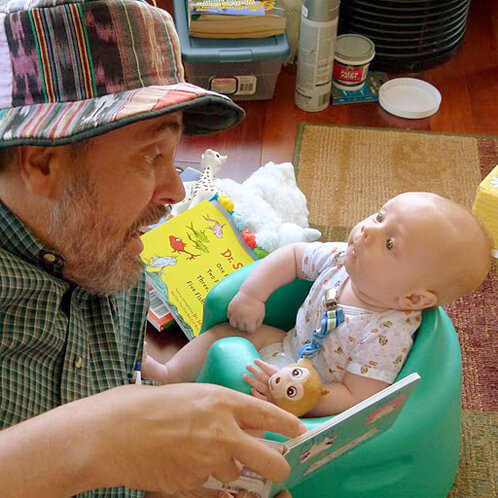 Notice Jamisen’s favorite ‘One Fish, Two Fish’ book in the background as Grandpa reads the always amazing “Moo Moo Baa La La” book (a gift from Artist Lisa McShane. She has one of Jamisen’s favorite shoulders to spit up on.) Jamisen still is loving his reading time AND as his neck strength improves, we’re noticing he has a longer attention span during reading time too.