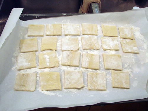 1. On a lightly floured work surface, roll out the puff pastry to a 16-by-11 ½ -inch rectangle. Trim to form a 10 ½-by-15-inch rectangle. Transfer the pastry to a large rimmed baking sheet and cut into 1 ¾-inch squares; you should have about 48. Freeze the squares until firm, about 30 minutes.