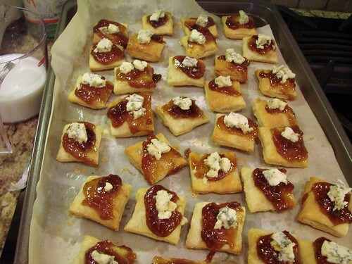 3. Return as many cooled squares as will fit to a baking sheet. Top each square with ½ teaspoon of the fig preserves. Sprinkle with the Stilton. The Stilton sort of melts, sort of doesn’t. It’s a nice consistency when it’s warm. You can serve these fantastic appys warm or at room temperature but take it from me, they are best when fresh out of the oven. Makes 4 dozen squares.Make Ahead The unbaked frozen pastry squares can be in an airtight container for up to 1 month.
