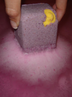 The fragrance was strong. It was a mixture of vanilla and berries. The lovely sweet scent coupled with the fuscia colored water was a relaxing experience. And, since the Solid Bath Melt was so large, I’ll get to copy the experience again tomorrow. After all, I have a slightly soggy half left.