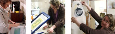 Here, I am working on the Soap Queen aprons and T-shirts. First I’m rinsing out the emulsion in the sink, next I’m printing the first color (the yellow hair) and finally I’m showing Anne-Marie how it will look when I get the next screen printed over the top. It’s a multi-step process that would be a huge blog post on it’s own. But if anyone is interested in a step-by-step Yudu tutorial, just let me know.