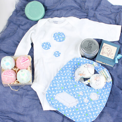 Notice that the onesie and the bib are both soapy’ish! The bib with the soap bar and bubbles and the onesie with the bubbles floating up the front. I know that our little Bramble Bump will be proud to wear both!