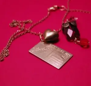 I have taken a small collection of things and made them into charms for this charm necklace. This necklace has a sweet little ‘i love you’ brass postcard, a puffed brass heart charm, a capped red faceted glass charm with red Czech glass dangle and a Czech glass flower bead in a pink with a bit of pale green.
