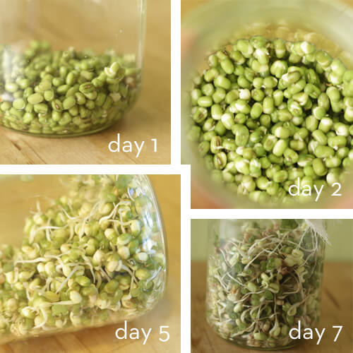 FOUR: Rinse 2-4 times a day until you get sprouts. It usually takes about 8 days for me to get good mung bean sprouts.