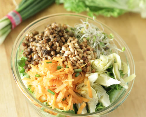 SIX: Eat them up! Here’s one of my favorite salads. It has marinated artichokes, grated carrot, lentils, and sprouts on top of fresh, crispy lettuce.