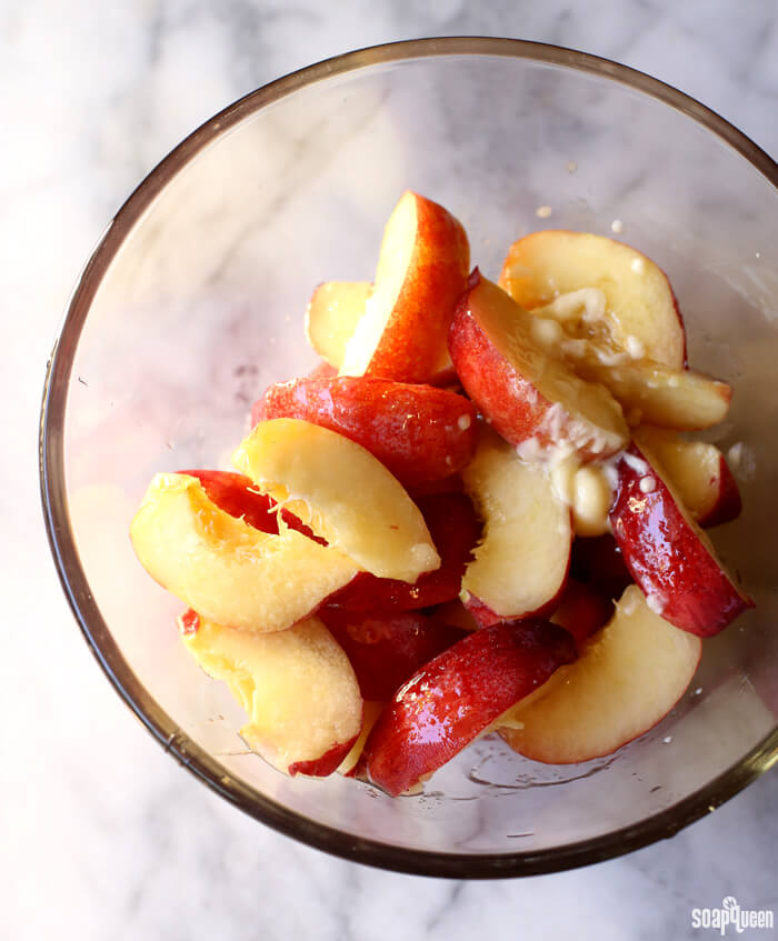 - Preheat oven to 350 degrees. Rinse the peaches and cut into halves. Remove the pit, and cut the halves into fourths. Place the peaches into a large mixing bowl. Add the honey and melted butter. Gently stir to fully coat the peaches in the honey and butter.