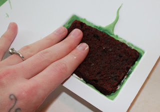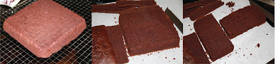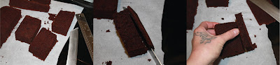 • Cut the bottom off of each of the rectangles and then slice the rectangles in half. You should be left with pieces 2 inches wide, 3 inches tall and ½ inch thick. These will be the middles of our chocolate covered cakes. You should get 12 slices total.