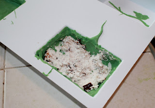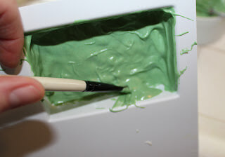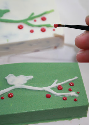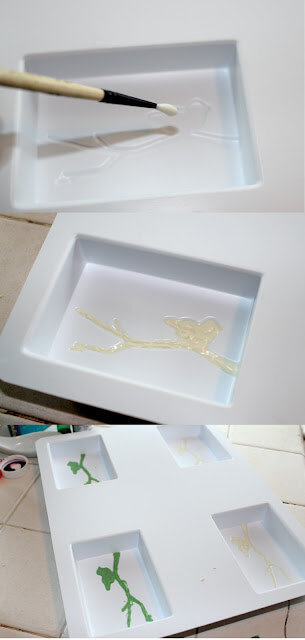 3) Using a small brush or popsicle stick carefully spread green chocolate into the recessed bird and branch part of two of the mold cavities. Do the same with the white chocolate in the other two cavities. You may get chocolate outside the edges and this is ok. Once the chocolate is set, about 5 minutes, using a small piece of paper towel rub off unwanted chocolate. You can use the tip of your finger to smooth out rough edges as well.