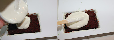 6) When the chocolate is set, spread a thin 1/4 inch layer of your whipped cream or chocolate mouse into the bottom of each of the mold cavities. Press one piece of your cut chocolate cake into each mold so that the cake sits below the edge of the mold cavity. This is so that we have space to top off with more melted chocolate.