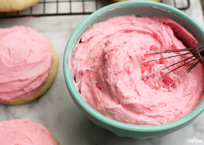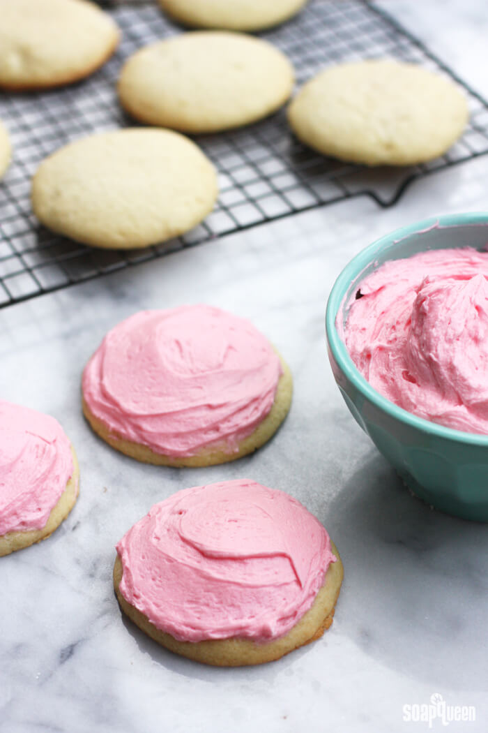 FrostingFROSTING: While the cookies cool, time to make the frosting! Using a stand mixer or hand mixer, whip the butter until soft and smooth. On slow speed, add the powdered sugar 1/2 cup at a time. Add the almond extract and salt and blend until fully incorporated. Add the milk as necessary. If you like a thinner frosting, feel free to add more milk one tablespoon at a time. Add red food coloring if desired, drop by drop until a soft pink color is achieved.