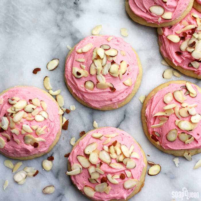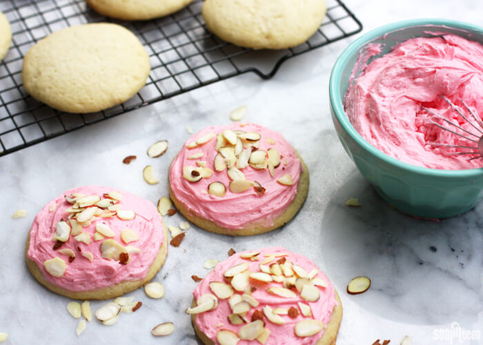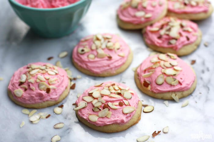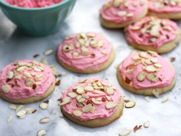 These Soft Almond Sugar Cookies are reminiscent of the large pink cookies from coffee stands. Soft, fluffy and buttery, the almond flavor gives them a pleasant twist. Shaved almonds are sprinkled on top to give a slight crunch. While the red food coloring in the frosting is completely optional, the pink frosting takes these cookies from delicious to delicious and adorable.Ā