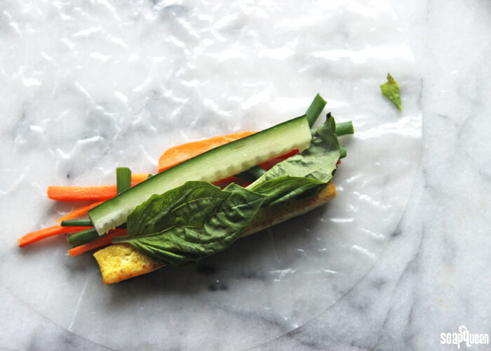 • Continue to fill the skin with carrots, cucumber, tofu, cilantro, green onion, basil and any other filling ingredient you prefer. Very carefully, begin to tightly roll the bottom half of the skin away from you, and tuck the outside sides inward to seal. Use your hands to tuck in the fillings as you roll. Roll until it is completely sealed. This step takes a little bit of practice! Your first few rolls may be a little sad, but you’ll get the hang of it.