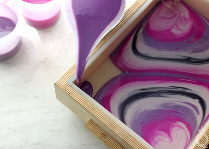 Bleeding colorants are usually dyes or FD&C colors that migrate into other layers of your soap over time. You can work the bleeding into your design, as seen in the Layered Lavender Cold Process Soap. If you’re not a fan of that look, make sure to use non-bleeding colorants.